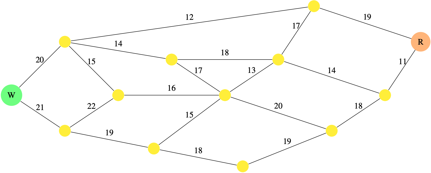 In the diagram below, the yellow circles represent nodes, the website is the green circle marked \(\text{W}\), and Robin’s computer is the orange circle marked \(\text{R}\).