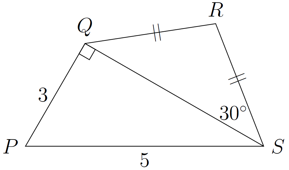 In the diagram, \(\text{PS}=5\), \(\text{PQ}=3\), \(\triangle \text{PQS}\) is right-angled at \(\text{Q}\), \(\angle \text{QSR}=30^\circ\) and \(\text{QR}=\text{RS}\).